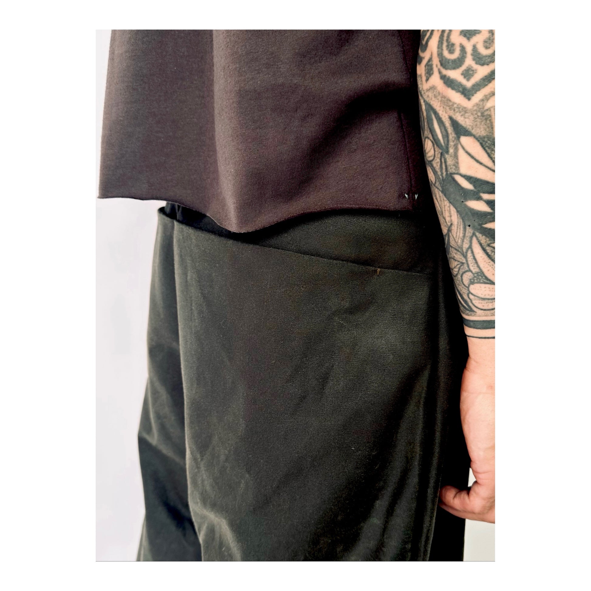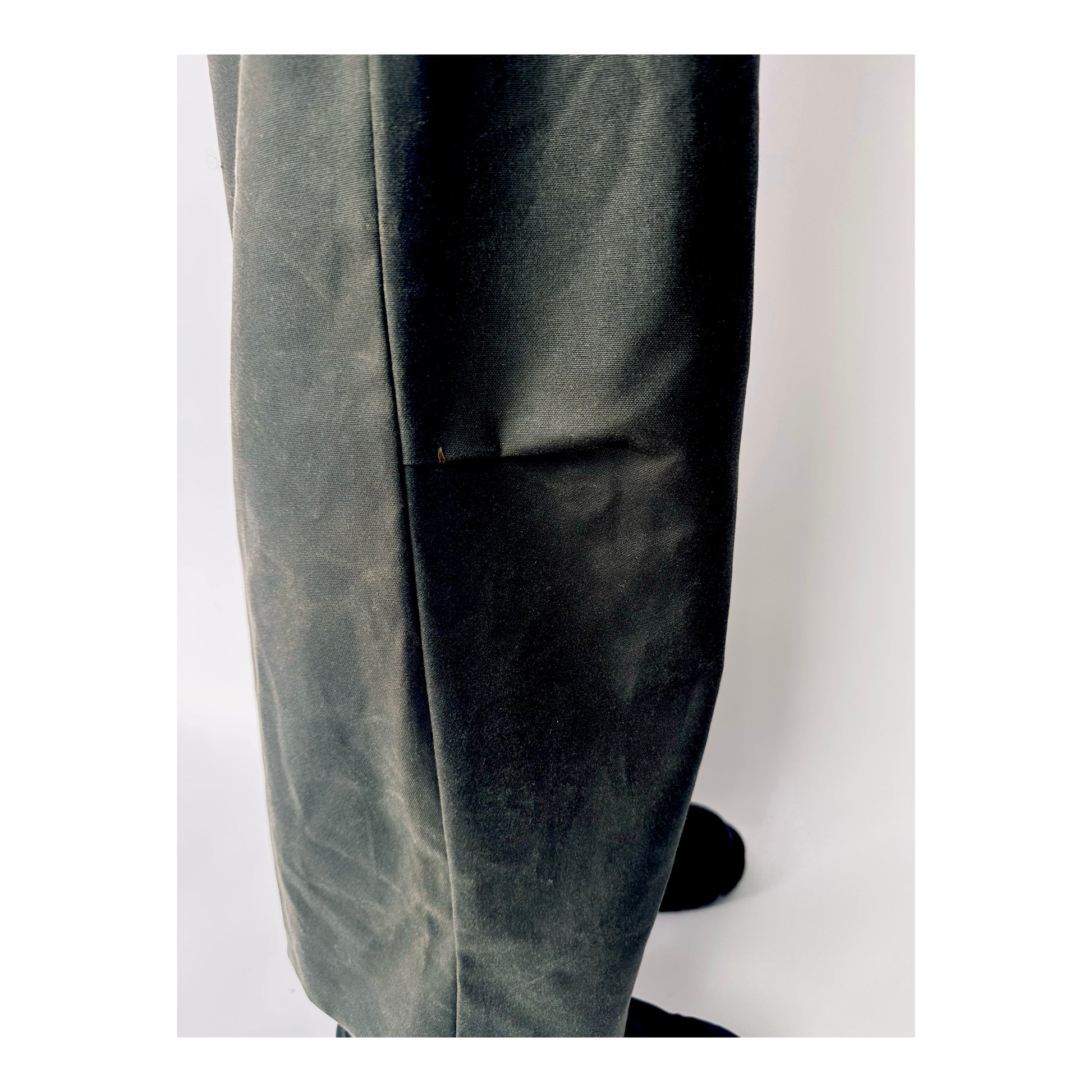 These pants feature hand-applied contrast color detailing, a hand-set triple hook closure, and functional back pockets.