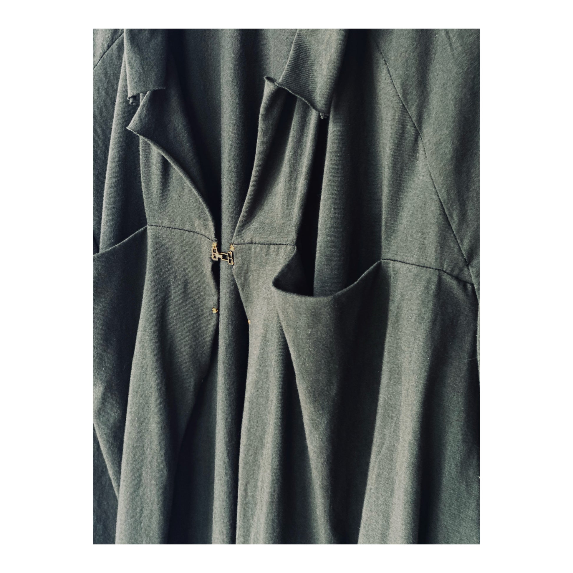 100% cotton jersey jacket with hand-detailed contrast stitching, raw edges, and a hand-set hook closure. Finished with a folded front pocket for soft structure.