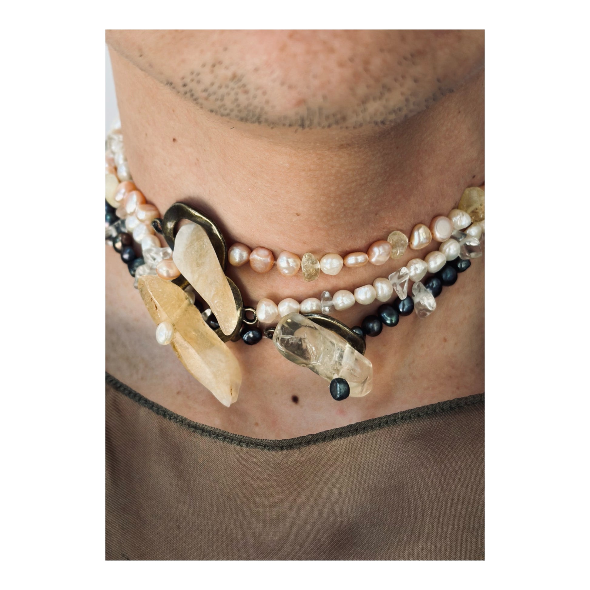 Handmade necklace featuring white, black, and pink freshwater pearls paired with citrine stones and gems for a naturally balanced finish..