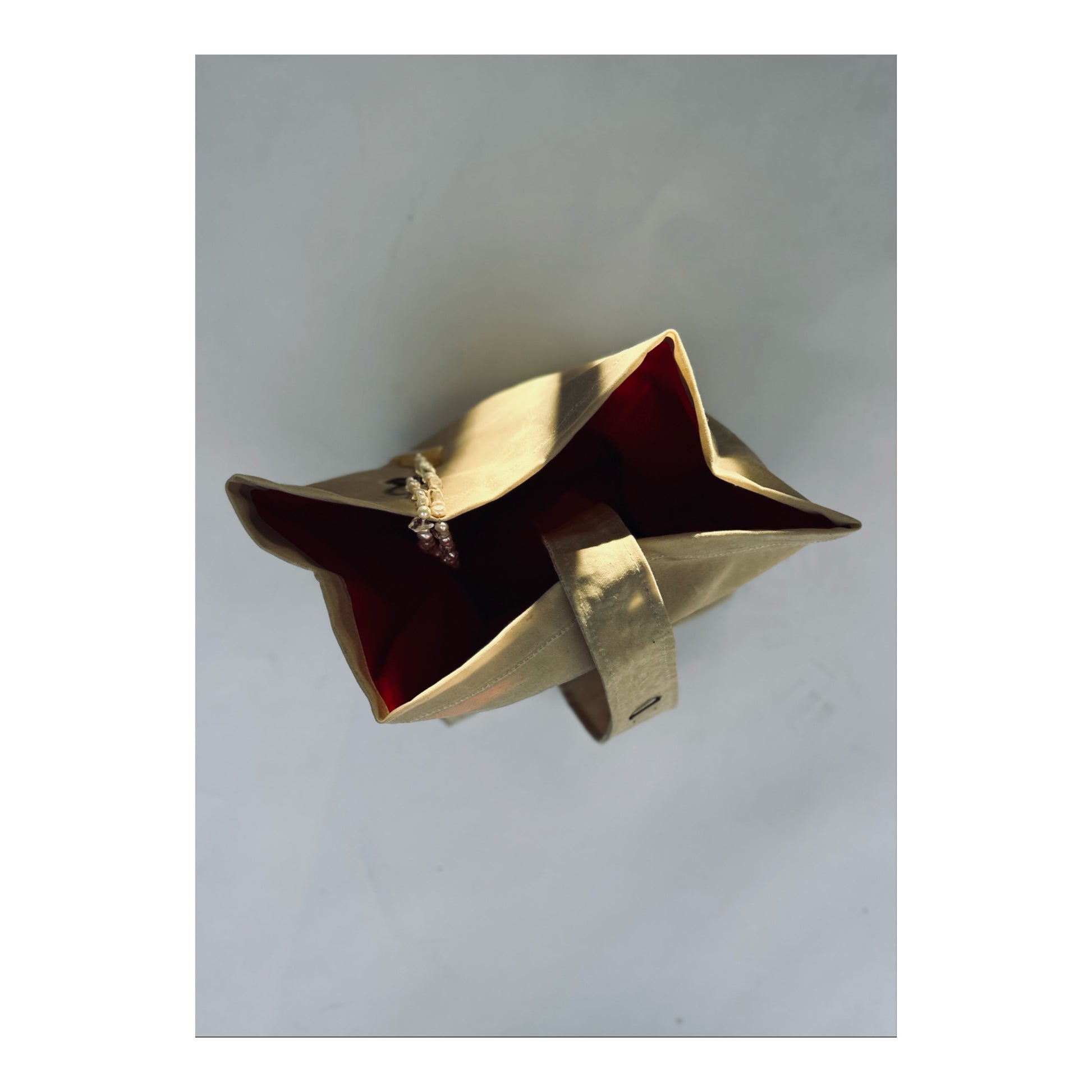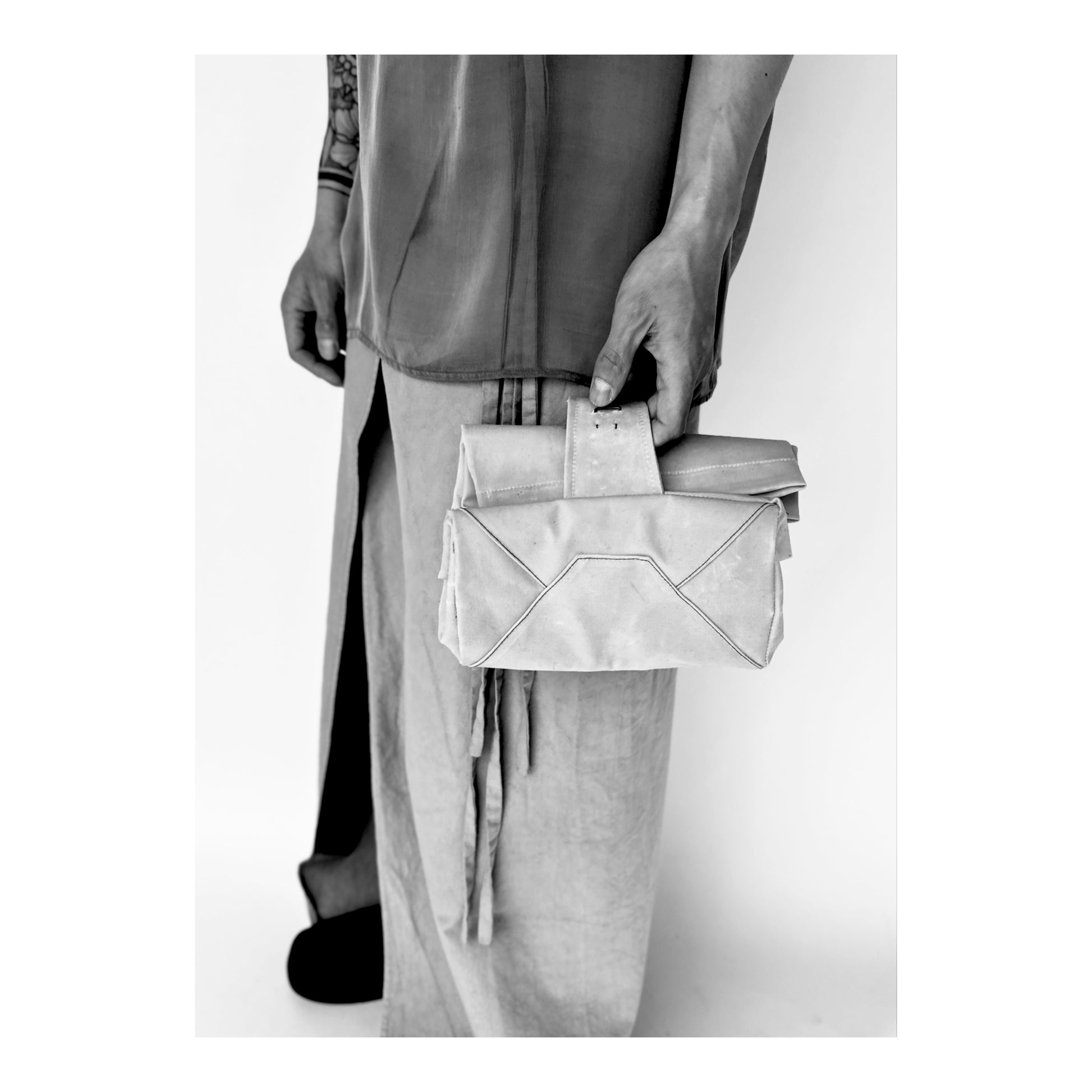 Crafted from off-white wax cotton with a bold red lining, this clutch features hand-detailed hooks and contrast stitching for a refined yet artistic finish. .